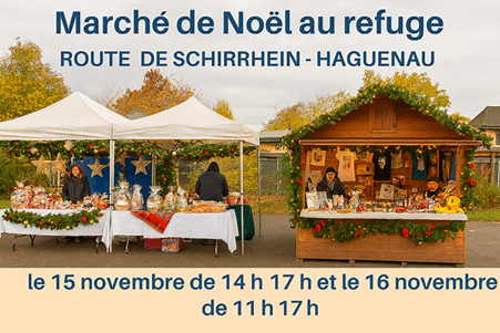 Découvrez notre Marché de Noël au refuge, route de Schirrhein à Haguenau. Le samedi 15 novembre de 14h à 17h et le dimanche 16 novembre de 11h à 17h.